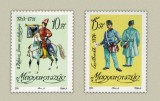 Postatisztek és alkalmazottak ruhái bélyegsor 10,- Ft -os bélyegén II. Rákóczi Ferenc postalegénye (1703-1711), a 15,- Ft -os bélyegen Levélhordók (1874) látható.