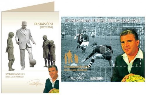 Am 28. März 2013 wird in Budapest zu Ehren des legendären Fußballers Öcsi Puskás eine Statue eingeweiht. Das erste öffentliche Standbild wurde in Óbuda errichtet. Die Magyar Posta und Lemezbörze,…plusz magazin haben aus diesem Anlass insgesamt tausend Stück Sonderausführungen von dem 2007 in gemeinsamer Ausgabe erschienenen Gedenkbogen In memoriam Ferenc Puskás auf den Markt gebracht. Der Aufdruck mit Goldfolie bildet die Silhouette der Statuengruppe, den Schauplatz und den Zeitpunkt der Einweihung ab. Das repräsentative Gedenkblatt mit dem Gedenkbogen wird mit einem Begleittext in ungarischer, englischer und spanischer Sprache auf den Markt gebracht.