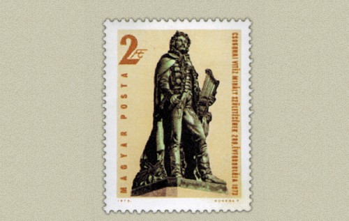 Csokonai Vitéz Mihály (1773-1805) születésének 200. évfordulója alkalmából megjelent bélyegen Izsó Miklós Csokonai Vitéz Mihály szobra látható.