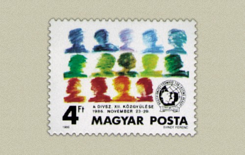 A Demokratikus Ifjúsági Világszövetség Budapesten tartott közgyűlése alkalmából megjelent bélyegen fejek és embléma látható.