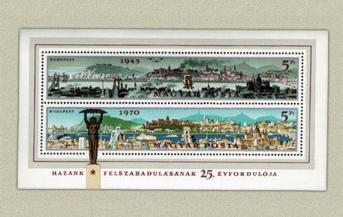 A Felszabadulásunk 25. évfordulójára megjelent blokkon a Budapesti Szabadságszobor és Budapest látképe látható.