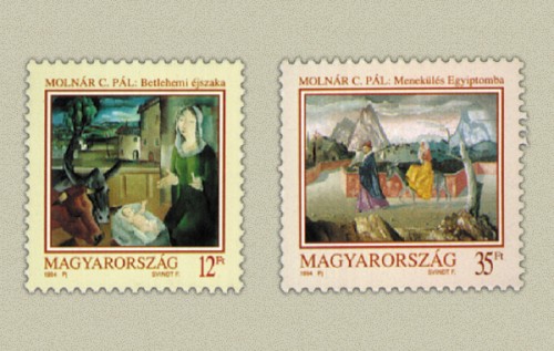 Karácsony alkalmából megjelent 12,- Ft -os bélyegen Betlehemi éjszaka, a 35,- Ft -os bélyegen, Menekülés Egyiptomba látható.
