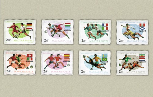 Argentínában megrendezett Labdarúgó Világbajnokság alkalmából megjelent 2,- Ft -os bélyegen NSZK-Lengyelország, a 2,- Ft -os bélyegen Magyarország-Argentína, a 2,- Ft -os bélyegen Franciaország-Olaszország, a 2,- Ft -os bélyegen Tunézia-Mexikó, a 2,- Ft -os bélyegen Svédország-Brazilia, a 2,- Ft -os bélyegen Spanyolország-Ausztria, a 2,- Ft -os bélyegen Peru-Skócia, a 2,- Ft -os bélyegen Irán-Hollandia látható.