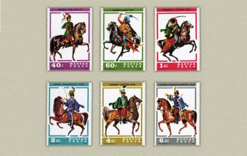 Magyar Huszárok bélyegsor 0.40 Ft -os bélyegen Végvári vitéz (XVII. század), a 0.60 Ft -os bélyegen Kuruc lovas (1710), az 1,- Ft -os bélyegen Baranyay-huszár (1762), a 2,- Ft -os bélyegen Nádor-huszártiszt (1809), a 4,- Ft -os bélyegen Sándor-huszár (1848), a 6,- Ft -os bélyegen Honvéd huszár-trombitás (1900) látható.