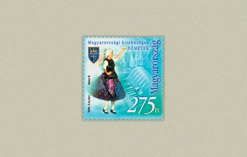 On the left of the stamp there is a woman dancing with the emblem of the National Self-Government of Germans in Hun-gary next to her. The background shows a part of a village, a reference to their architecture, and a detail of an accordion. On the special first day cover accompanying the stamp there is a part of a village, while the postmark features a stylized drawing of the emblem also shown on the stamp.
