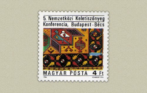 The International Conference on Oriental Carpets postage stamp in honor of published Crivelli, Anatolian carpets XV. century can be seen.