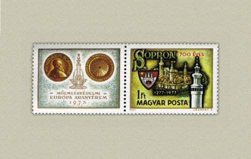 Sopron várossá nyilvánításának 700. évfordulója alkalmából megjelent szelvényes bélyegen Sopron 1610 -beli látképe, a szelvényen Műemlékvédelmi Európa Aranyérem látható.