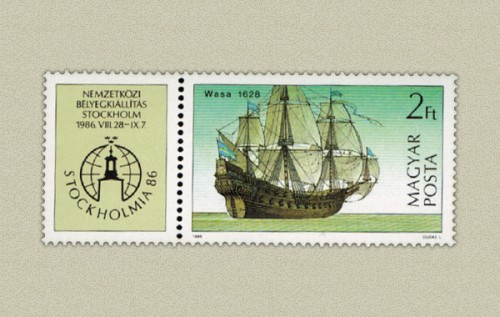 A Stockholmia '86 szelvényes bélyegen a "Wasa" Vitorlás (1628) látható.