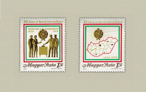 A tanácsrendszer 25. évfordulója alkalmából megjelent 1,- Ft -os bélyegen Szavazás, az 1,- Ft -os bélyegen Magyarország államigazgatási térképe látható.
