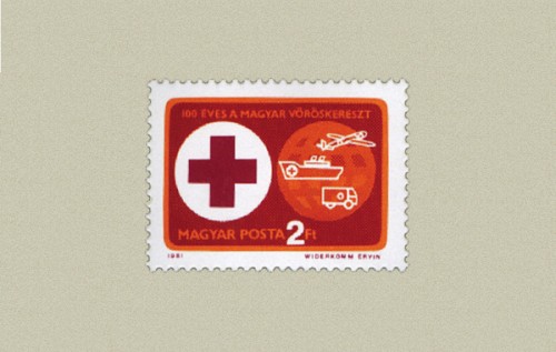 A Magyar Vöröskereszt 100 éves évfordulójára megjelent bélyegen, Vöröskereszt és vöröskeresztes járművek látható.